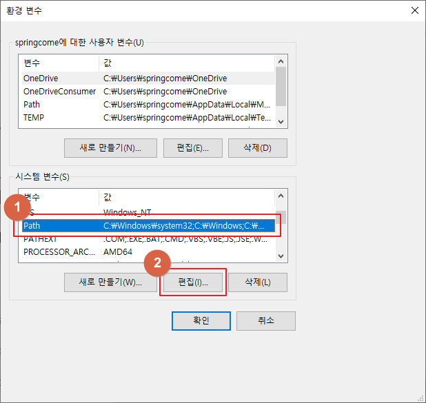 시스템 변수 [Path]를 찾아 편집을 눌러줍니다.
