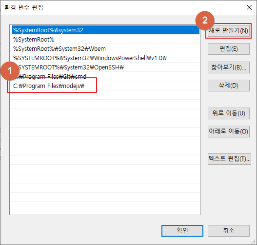 설치한 프로그램의 환경변수가 정상적으로 추가되었는지 확인하고 만약 추가되지 않았으면 새로 만들기를 눌러 추가해줍니다.