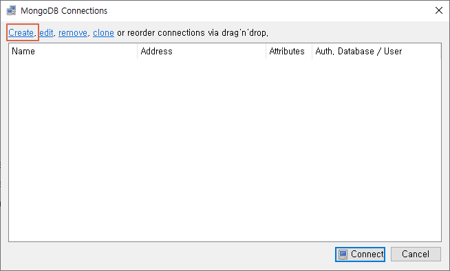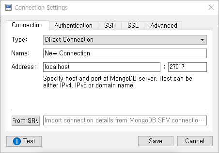 제 PC에설치된 DB를 사용할것이므로 Address는 localhost, Port는 27017이 기본 Port이므로 아무것도 변경하지 않고 Test를 눌러 접속할수있는지 확인합니다.