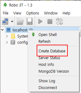 localhost를 우클릭하면 Create Database메뉴를 클릭하여 Database를 생성할수 있습니다.