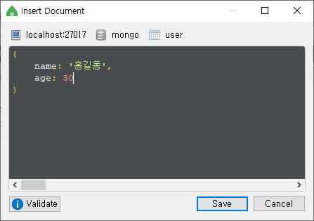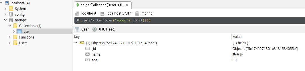 저장후 user collection을 더블클릭하면 저장된 document를 확인할수있습니다.